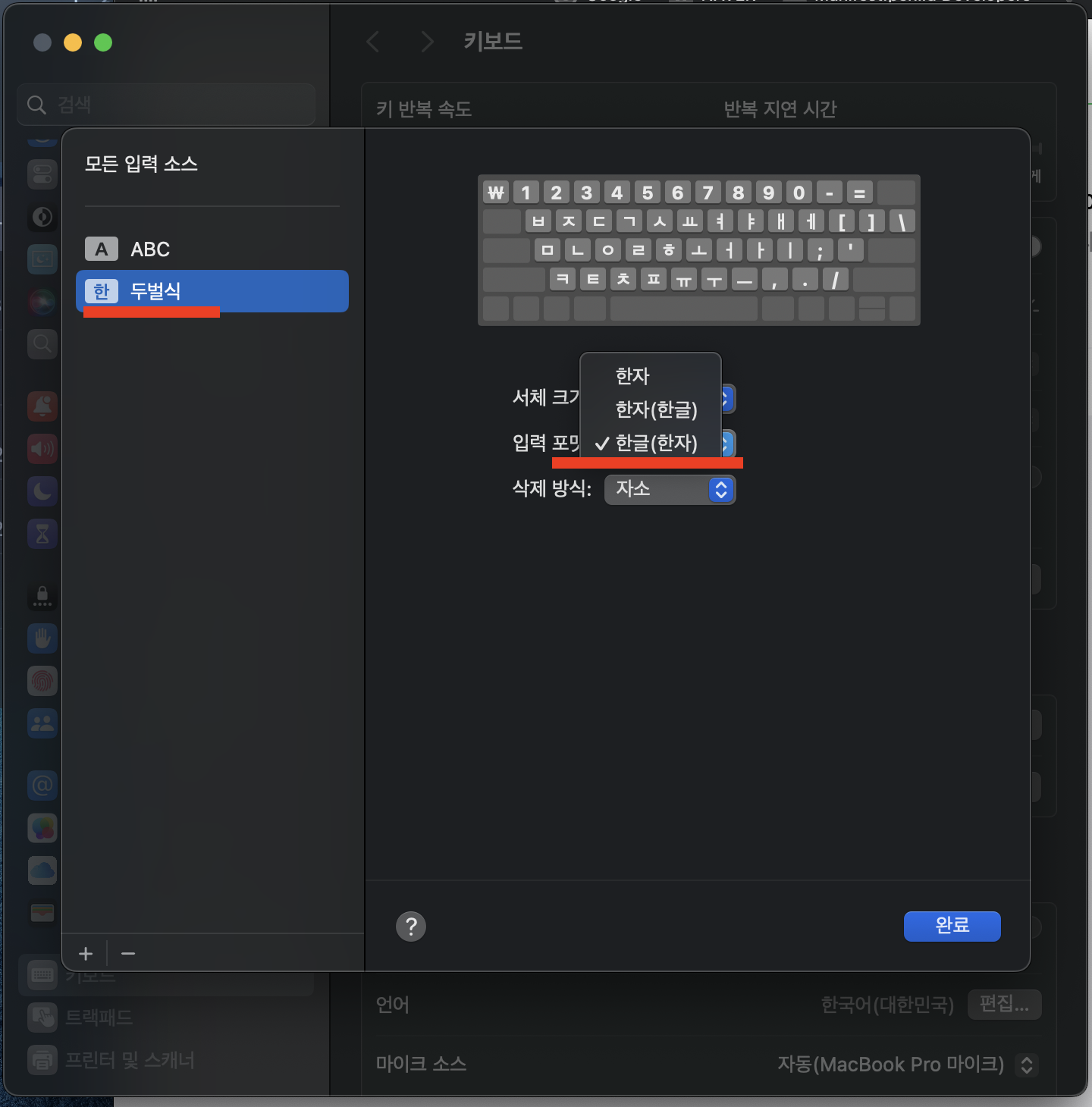 2. 두벅식 클릭 - 중간 입력 포멧을 눌러 한글(한자)로 바꾸고 '완료'